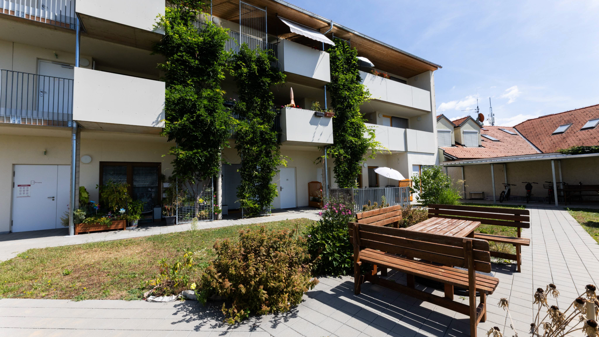 Die 14 barrierefreien Wohnungen eignen sich für Einzelpersonen und Paare. Jede Wohneinheit verfügt über eine Wohnküche, ein Schlafzimmer, einen Vorraum sowie ein Badezimmer mit WC. Der großzügige Gemeinschaftsgarten grenzt an eine Gärtnerei und bietet nicht nur einen bunten Ausblick, sondern auch viele Möglichkeiten zur aktiven Mitgestaltung.