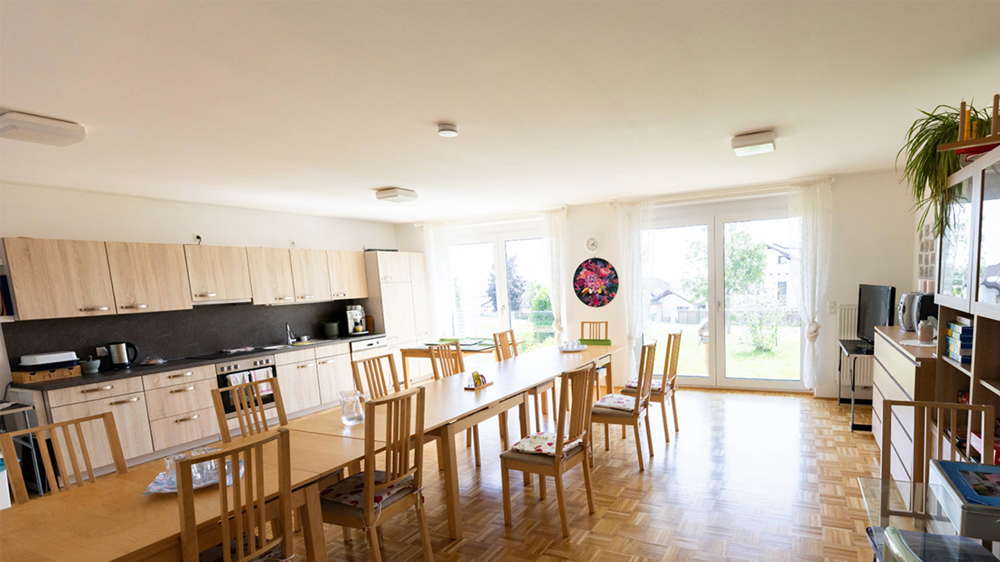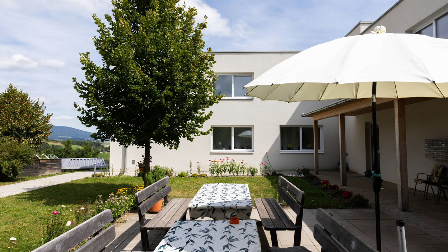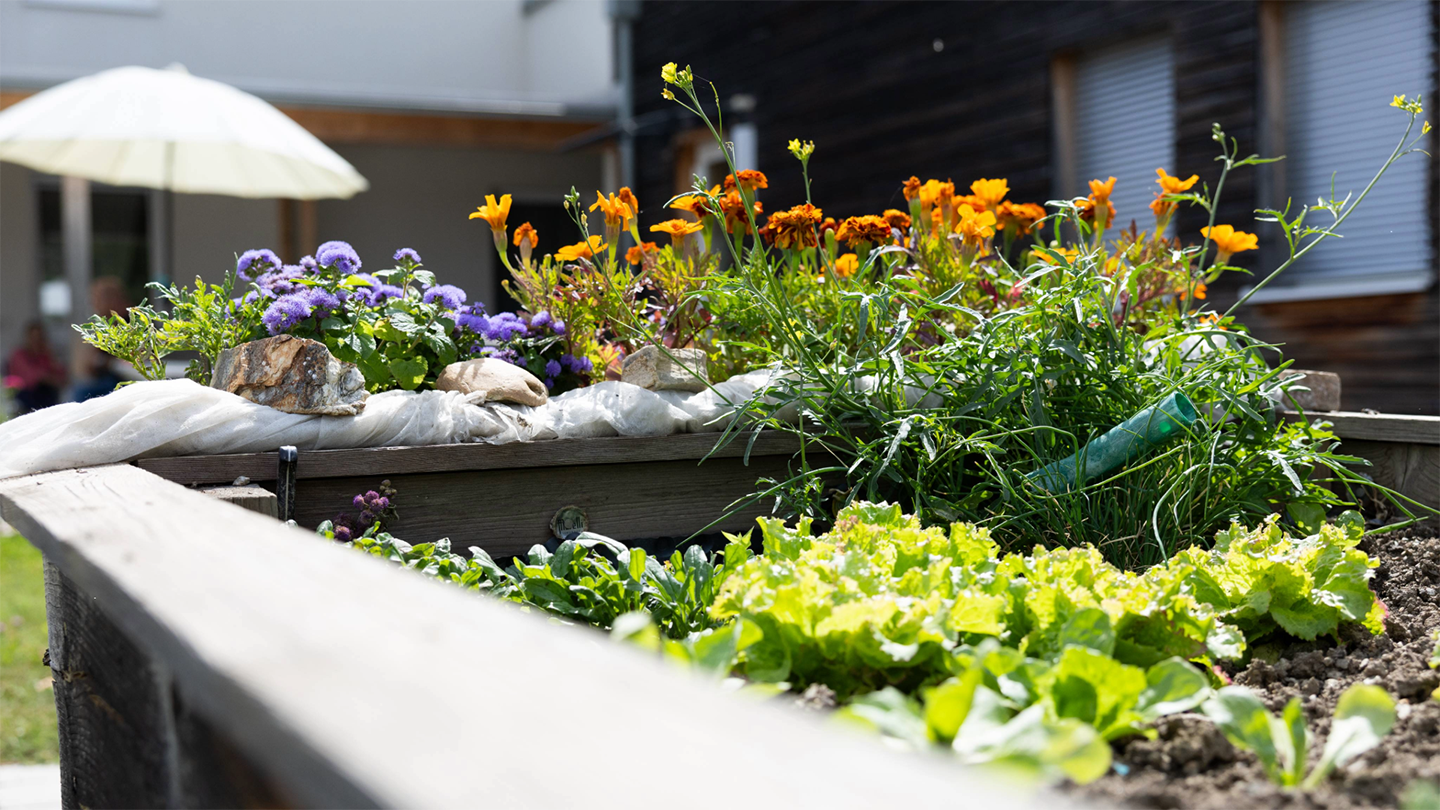 Ein Restaurant und eine Hausärztin im selben Gebäude sorgen für kurze Wege. Zusätzlich unterstützen ein kostenloses Einkaufsservice der Gemeinde und gemeinsame Spaziergänge zum nahegelegenen Hofladen die Bewohner:innen im Alltag. An warmen Sommerabenden wird die Terrasse im Gemeinschaftsgarten zum Mittelpunkt des Hauses. In Hochbeeten ziehen die Bewohner:innen Kräuter und Salate, die für das regelmäßige gemeinsame Kochen und Essen genutzt werden.