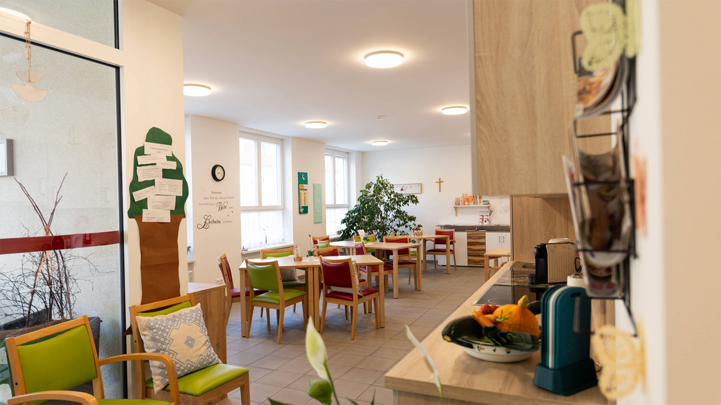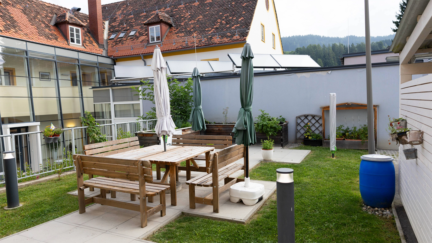 Das Betreute Wohnhaus liegt mitten am Marktplatz im Herzen von Obdach und seine Bewohner:innen sind bestens in das aktive Gemeindeleben eingebunden. Geschäfte und Einrichtungen des täglichen Bedarfs sind bequem erreichbar, der örtliche Nahversorger liefert bei Bedarf kostenlos Einkäufe bis in die Wohnung. In den warmen Monaten wird der Gemeinschaftsgarten zum Mittelpunkt des Hauses: Hier genießen die Bewohner:innen die Sonne, tauschen sich aus und ziehen in Hochbeeten Gemüse, Salate und Kräuter, die gemeinsam zu Suppen verarbeitet werden.